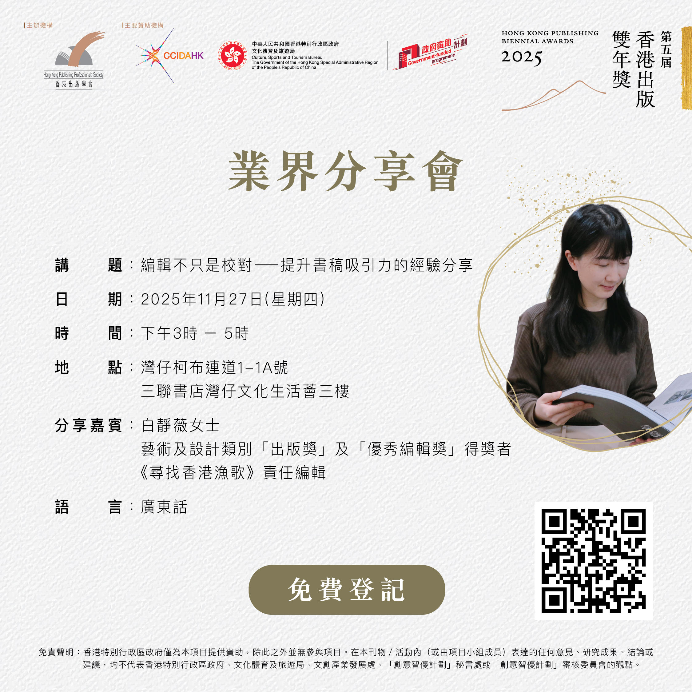 #HKPBA #香港出版雙年獎 #香港出版學會 #CSTB #文化體育及旅遊局 #文創產業發展處 #CCIDA #CCIDAHK #出版業界 #第五屆香港出版雙年獎 #業界分享會 #尋找香港漁歌 #漁歌 #優秀編輯獎 #編輯分享
