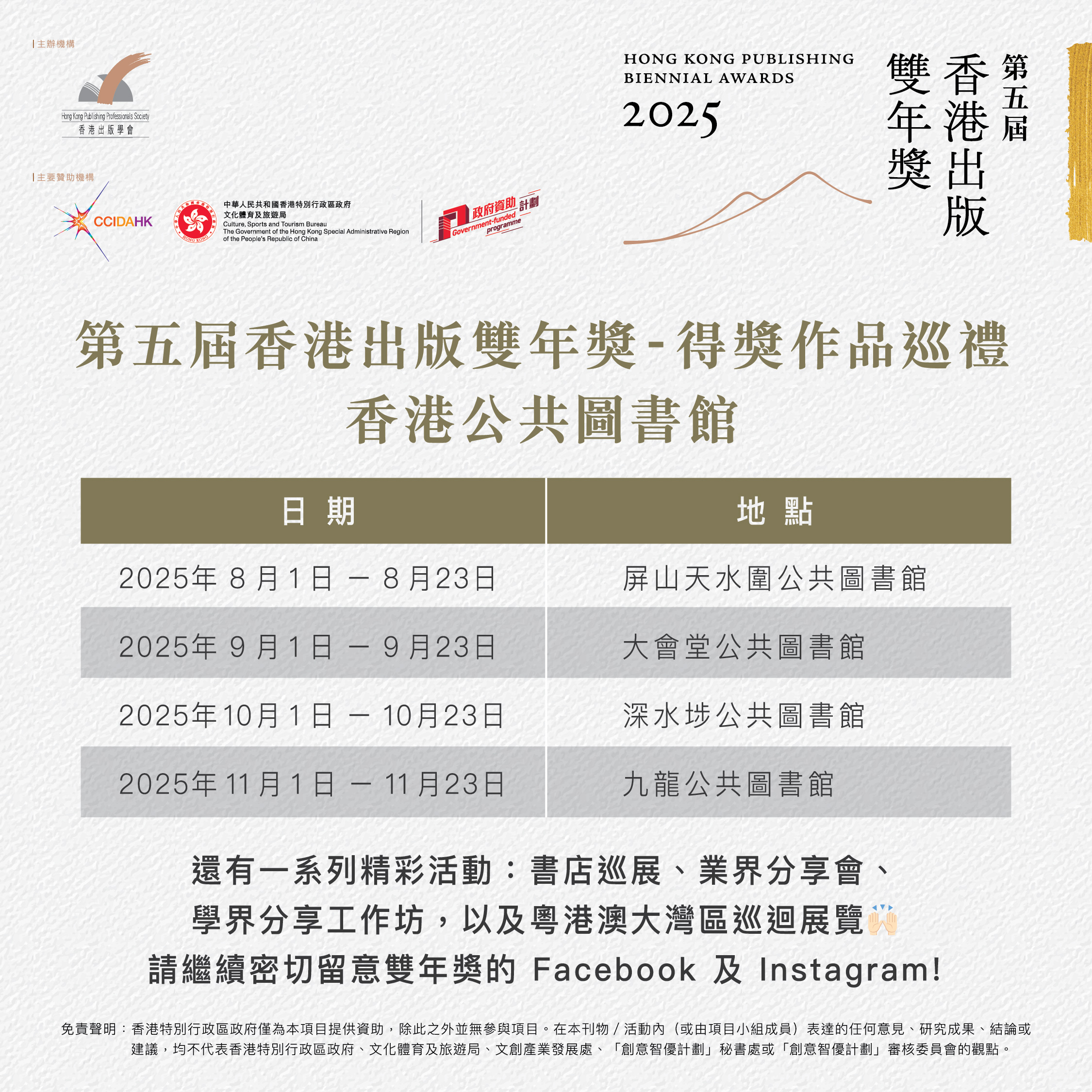 詳情今年的雙年獎得獎作品將於8月至11月期間在香港不同地區的公共圖書館展出。歡迎大家在圖書館開放時間內免費入場參觀 ,抓住這個難得的機會,欣賞本地出版的精彩作品!