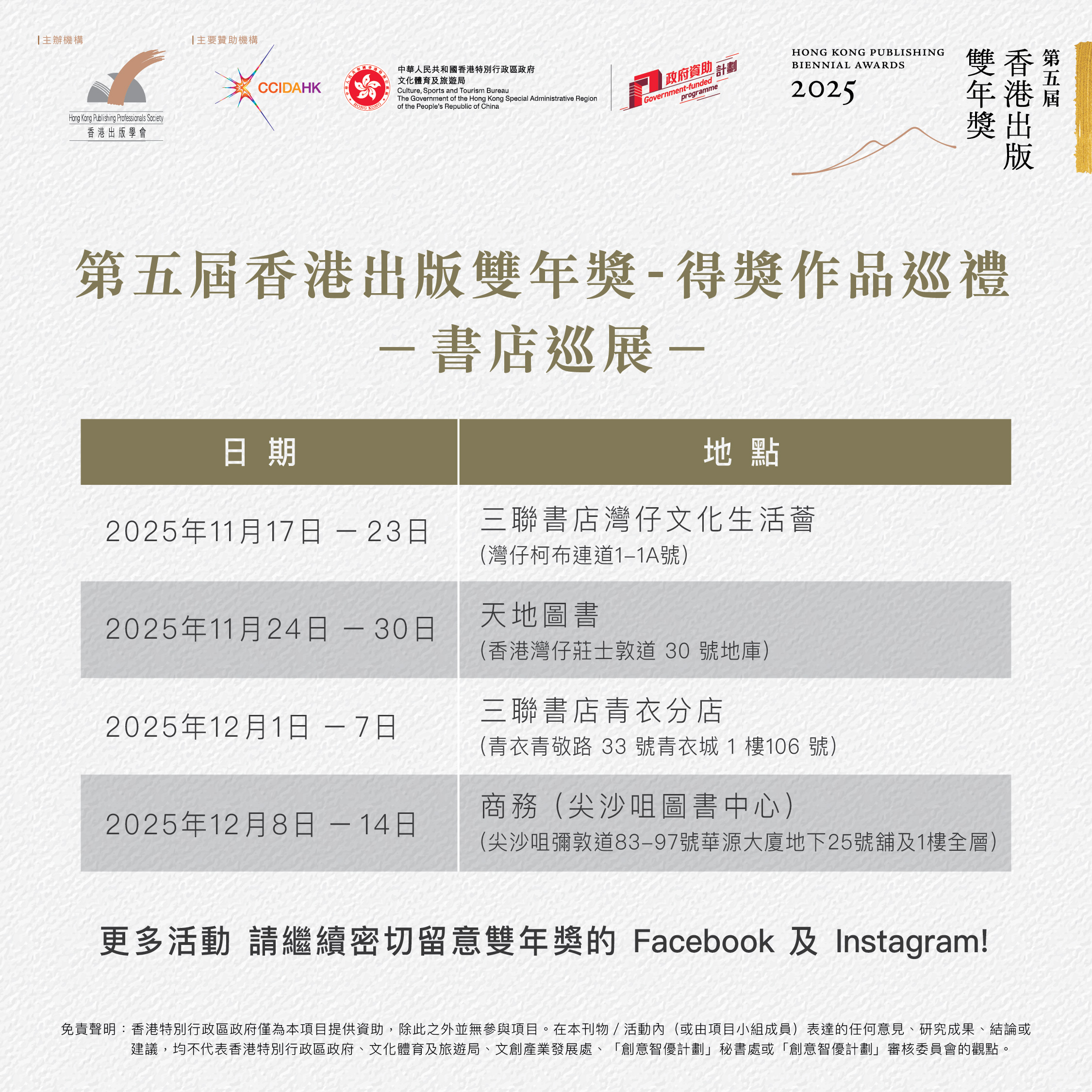 由 11月至 12月,今屆雙年獎的得獎作品將陸續於不同書店展出。